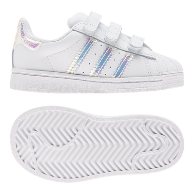 The one. The only. The adidas Superstar Shoes. This streetwear icon first hit the hardwood in 1970. Fifty years later, it's still relevant. This infants' pair is sized down so your little one can style just like the grown-ups. Iridescent 3-Stripes and heel tab give them a touch of extra shine. Hook-and-loop straps make them easy to put on and take off, no matter how wiggly they are.
